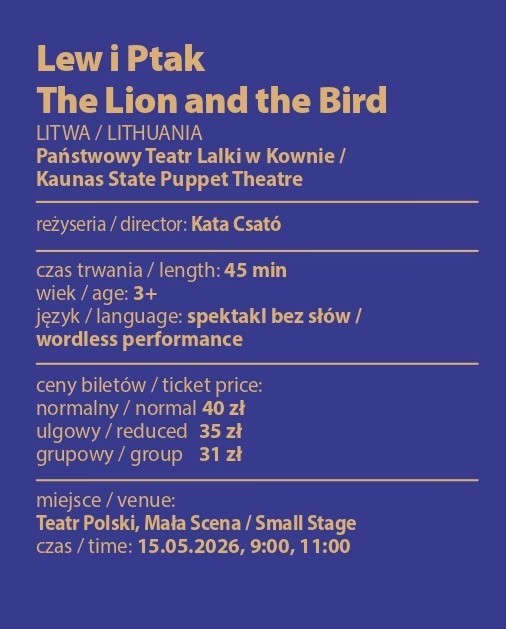 The performance received the Golden Stage Cross Award for the Best Puppet and Object Theatre Performance of 2023. The play is a subtle and inspiring tale about friendship and its meaning. One day, Lion finds an injured Bird in his autumnal garden. Lion differs from other lions: sensitive and caring, he even allows Bird to live in his cosy home. So begins an unexpected but true and profound friendship between two very different animals. Days go by, Christmas comes and goes, Bird recovers and wants to leave, and the friends inevitably have to part. However, true friendship never disappears, and a dear friend lives in a very special place – in the heart. Until the moment when the friends meet again…